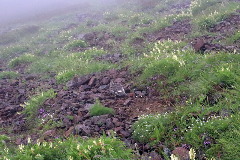 翌朝の水晶岳登頂は雨だったが、雷鳥の親子3羽に合うことができた。