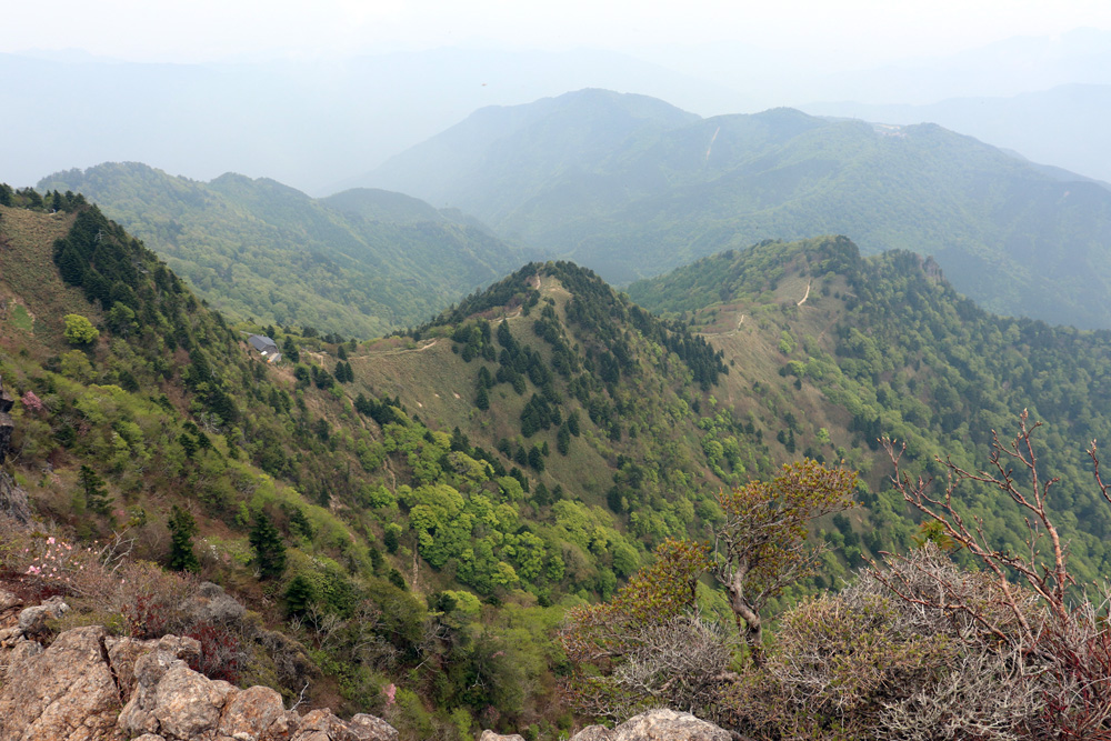 前日登った瓶ケ森が霞に浮かぶ。手前は大森山