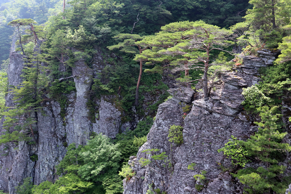 雄滝と雌滝を振り返り、岩場と松の木の風景を観賞した。
