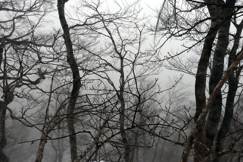 霧に包まれて見えるはずの烏ケ山が見えない。このまま進んでも目指す写真は撮れない!