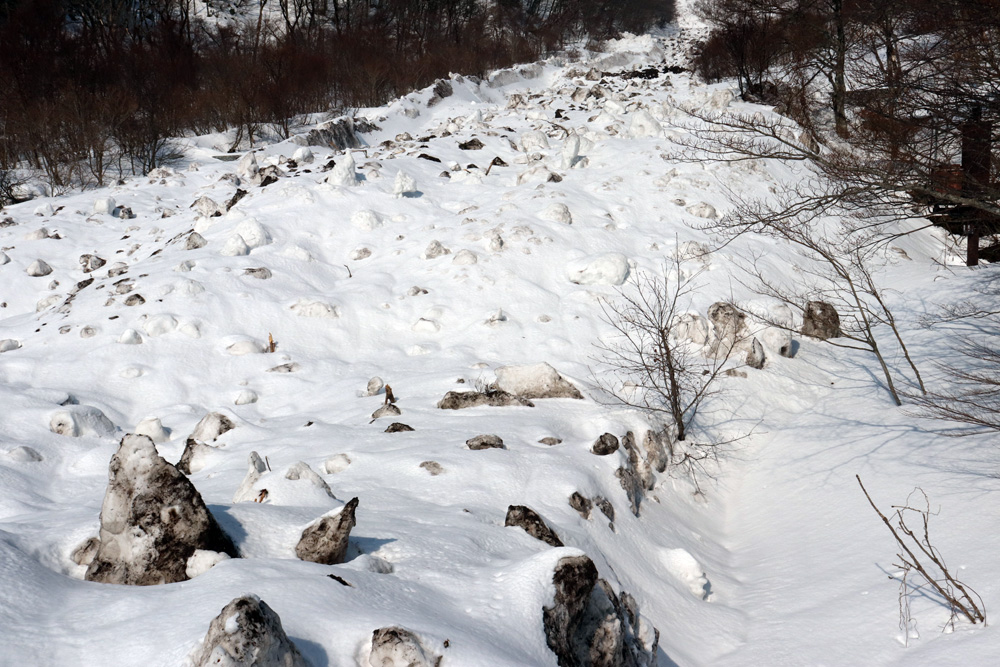 一ノ沢の雪崩跡は凄かった。岩のブロックが旧車道を乗り越え、橋まで迫っていた。