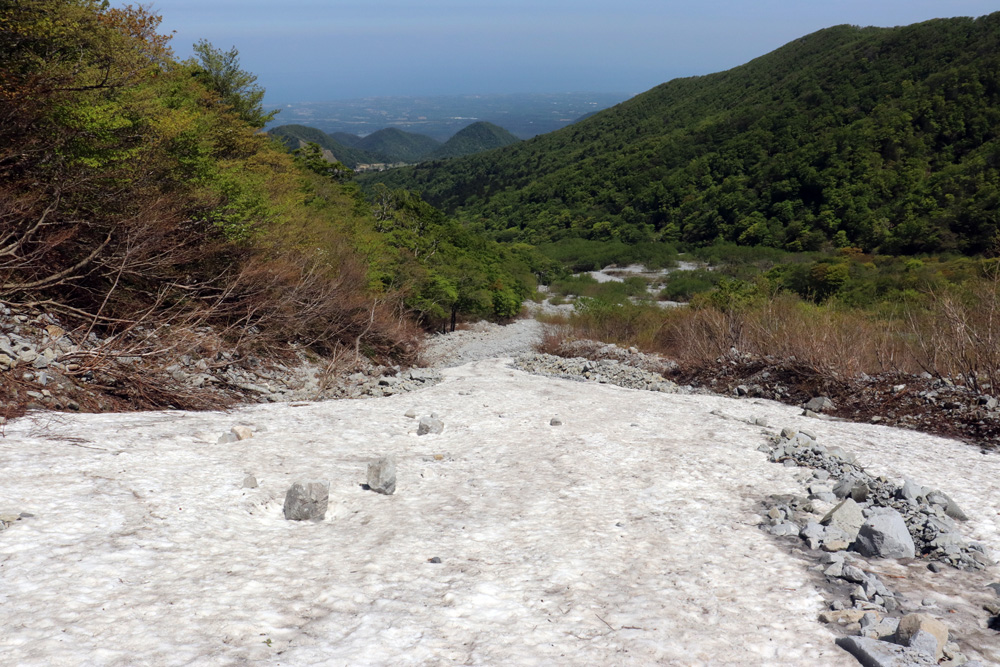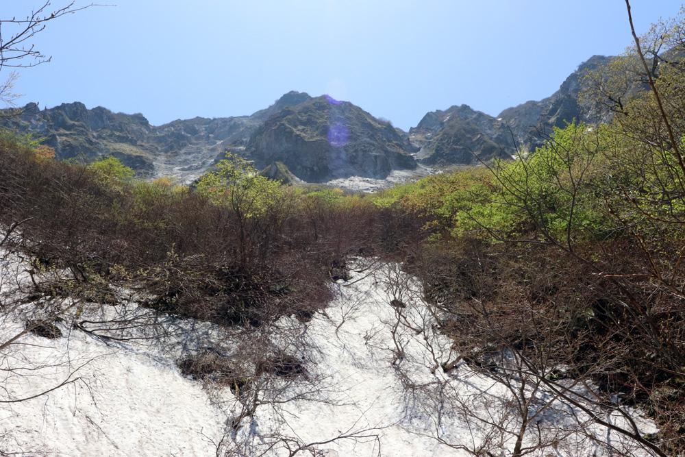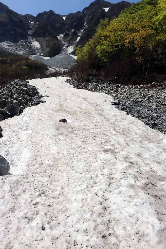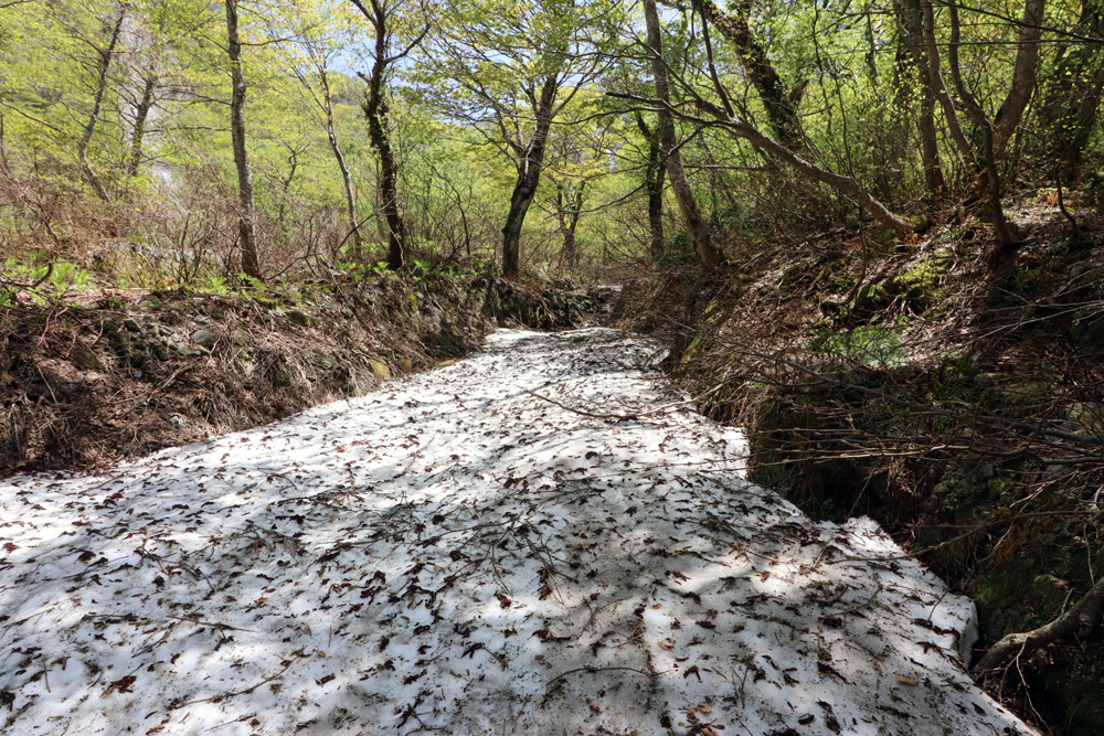 砂滑り手前で出会った雪渓。ヤブ漕ぎで無くしたストックを回収のロス