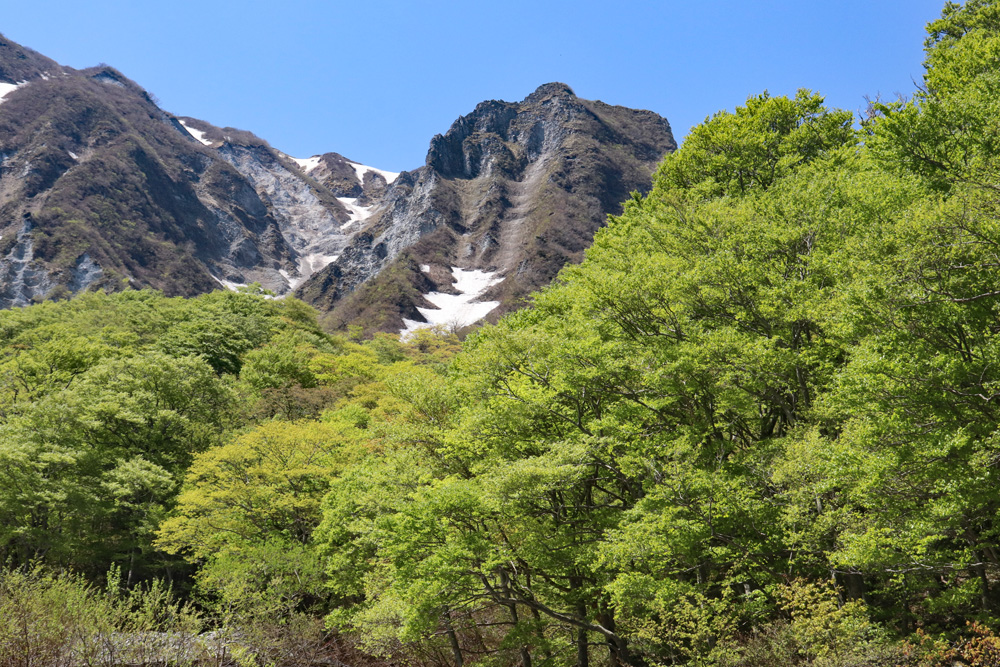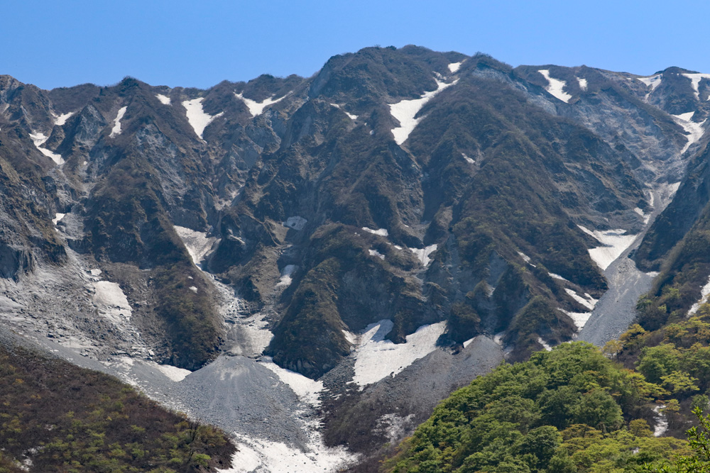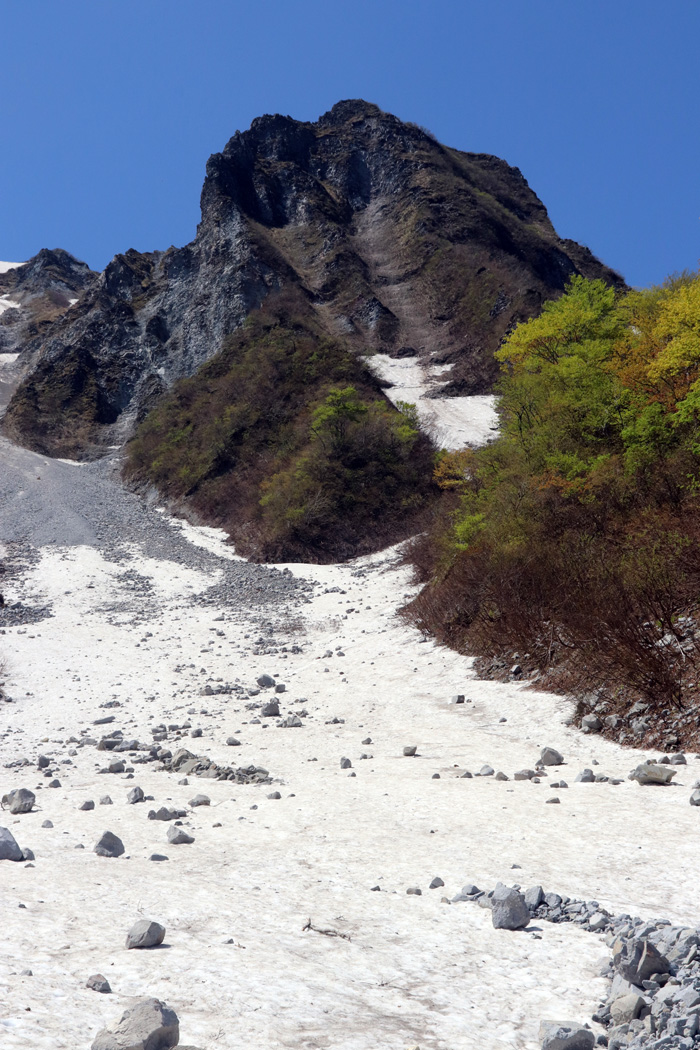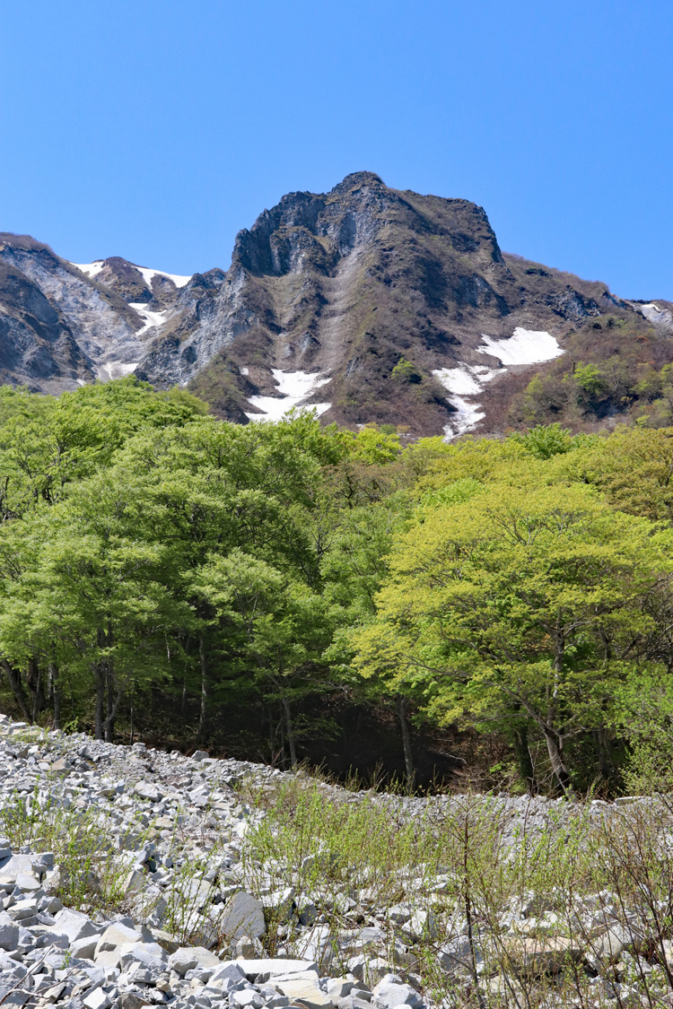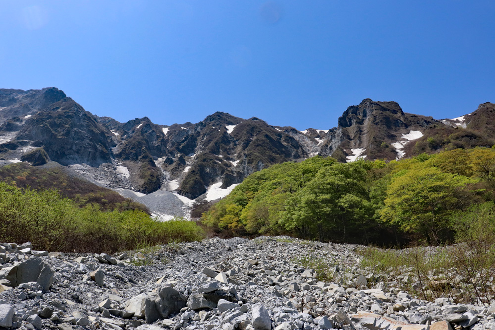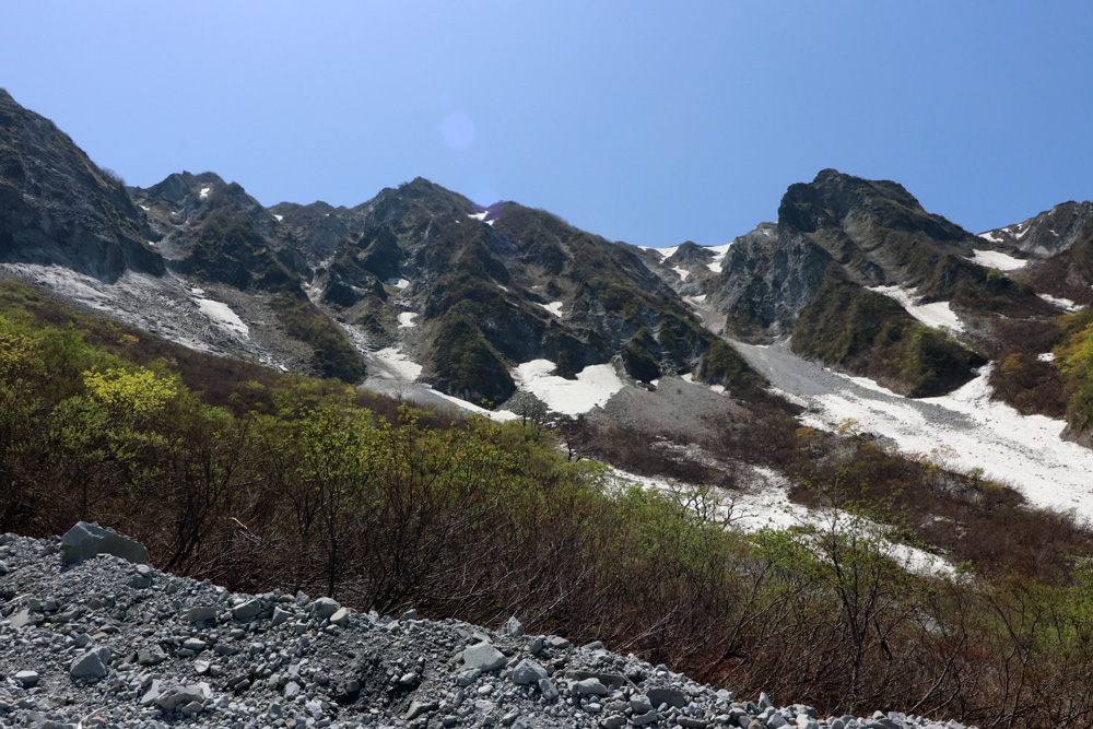 残雪と新緑の大山北壁の撮影に元谷へ入った。まず別山と弥山尾根の撮影を目指した。