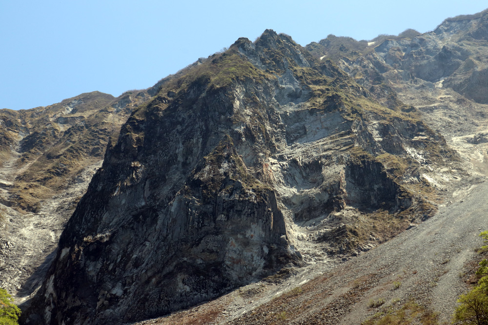 砂滑りから正面に大屏風岩。落石の多いところだ