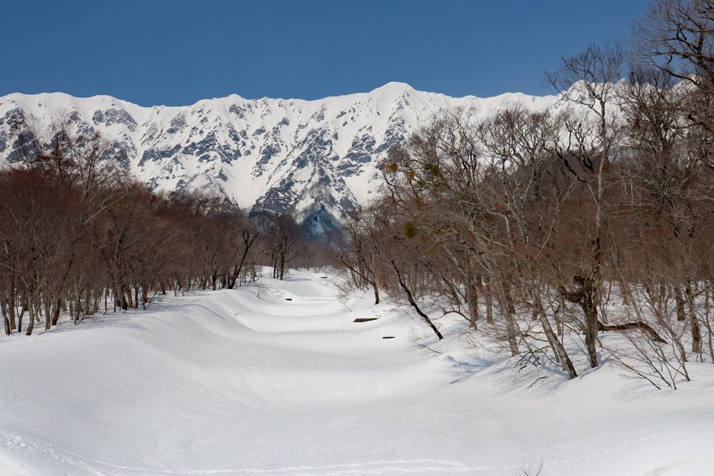 文殊谷はトレールなく、一人ラッセルで時間切れ、引き返した。