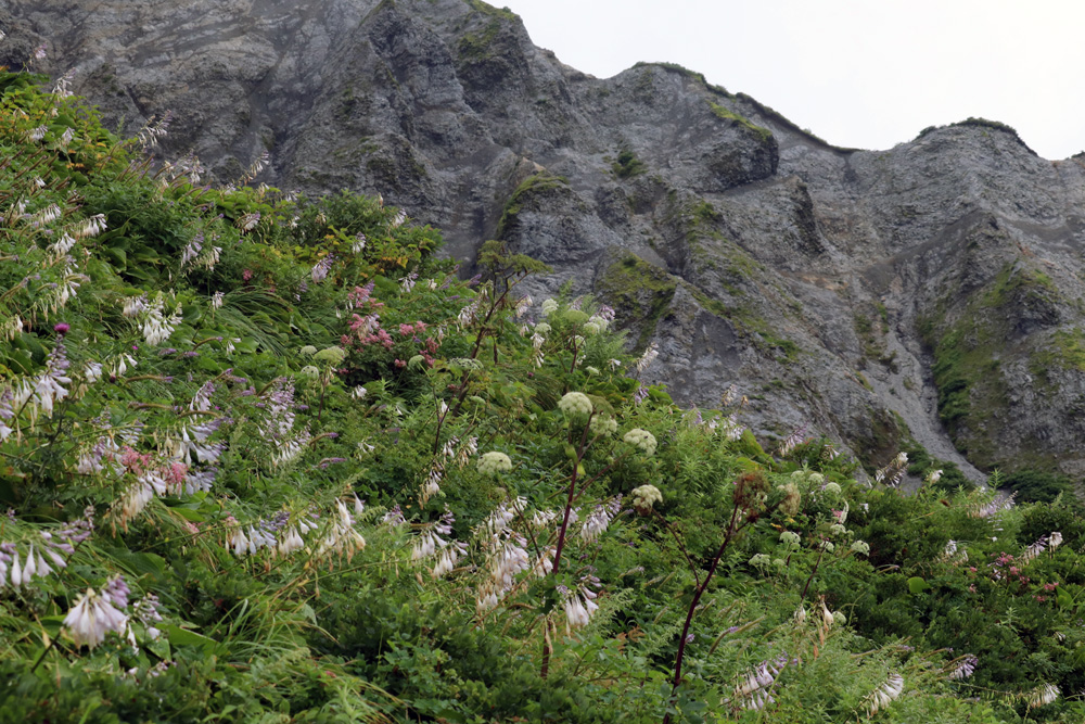 キリン峠からの槍尾根は雄大な景色だ。お花畑に入ると一面に広がる花の群生が素晴らしい。