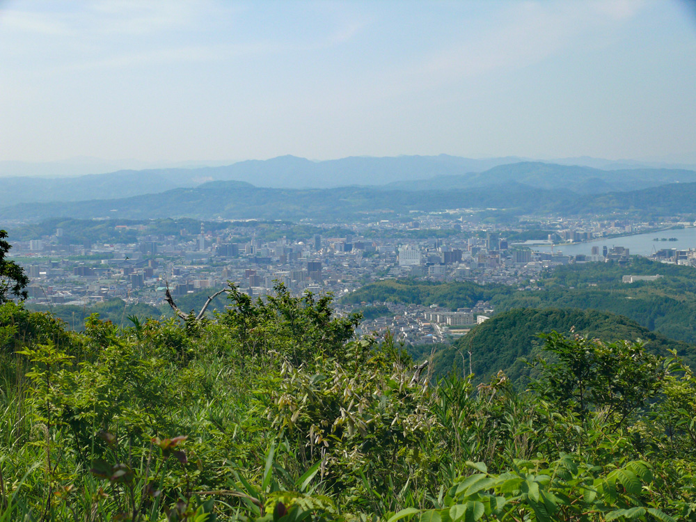 33度と暑い日で汗だくに、今岡展望所で市街を見下ろしながら最後の水分を摂った。