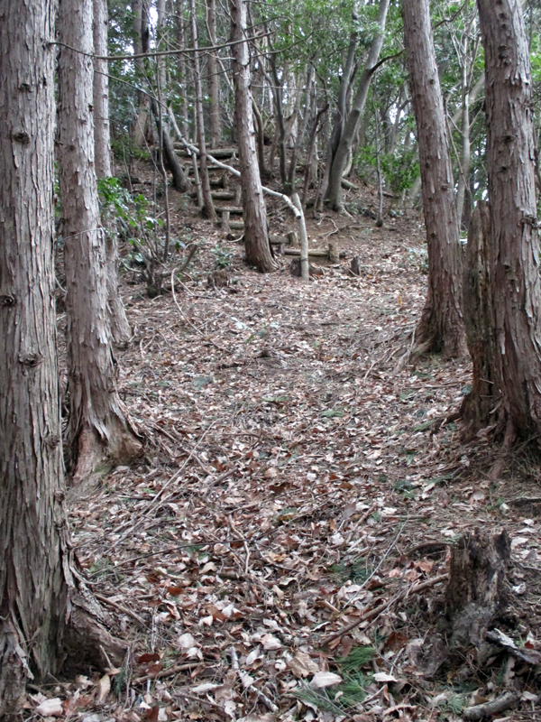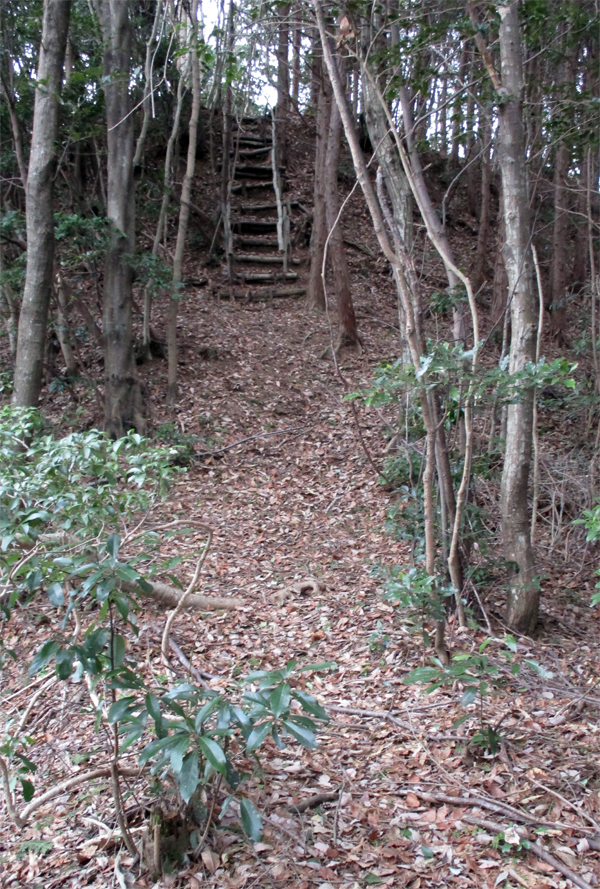 北口の本丸階段。本丸の右側には深い竪堀が3本あった