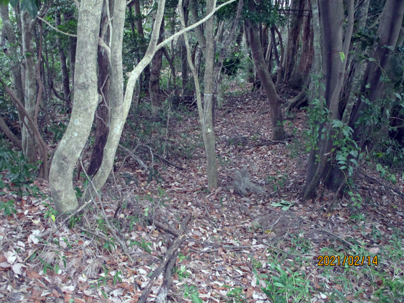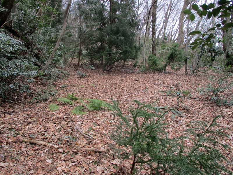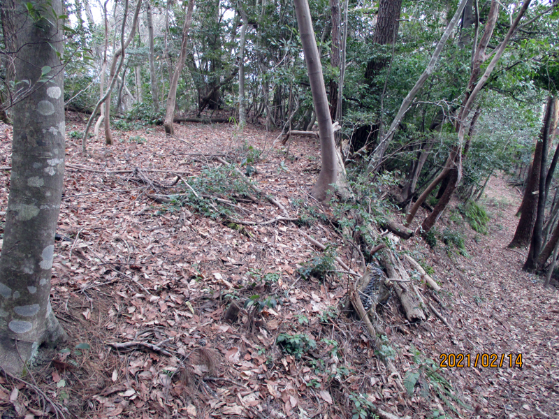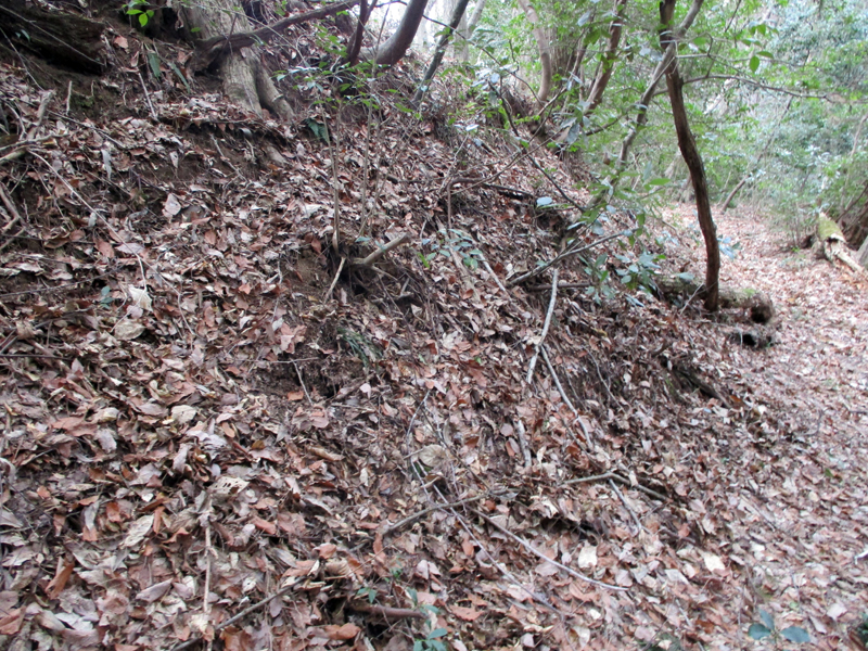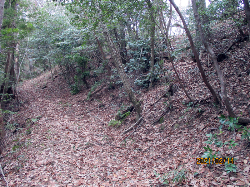 勝山城跡から登ると、ここから入口城塞群が始まる。この下には池や田んぼ跡の平地がある