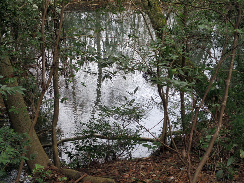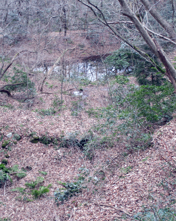 勝山城跡への下りには池や田んぼ跡の平坦地があり、多数の兵の生活跡が伺える。