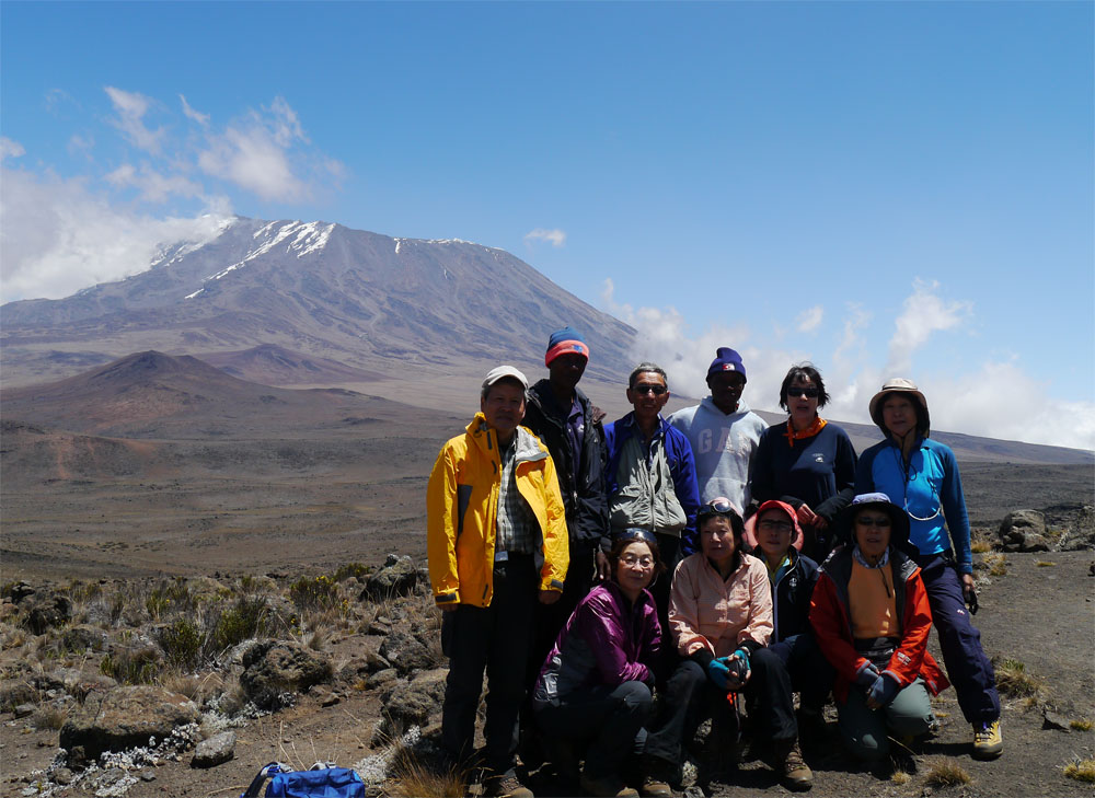 キリマンジャロ登山。4000メートル付近でキボ峰を背景にMHC9名