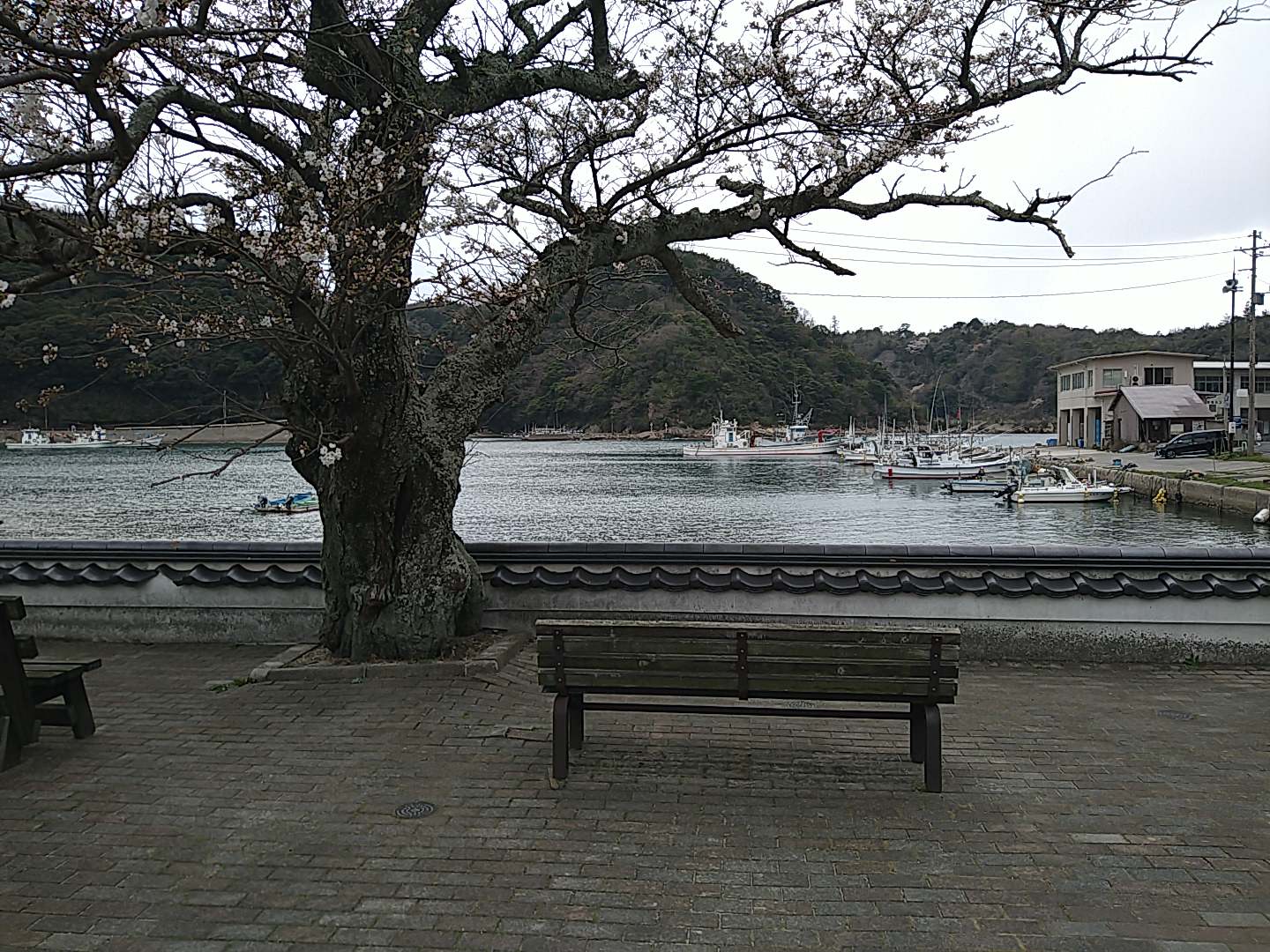 温泉津漁港と桜の木