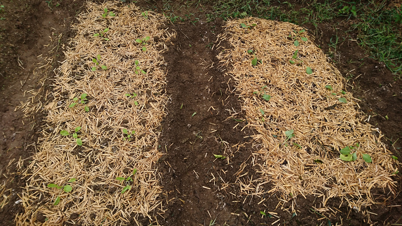 マルチは狭くて使えないのでモミガラで保温と雑草除けする。水と適度な肥料を絶やさず与える。