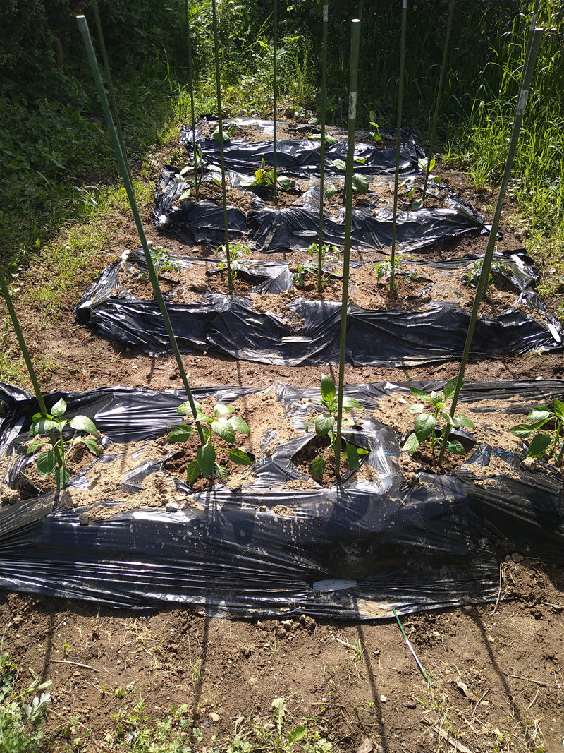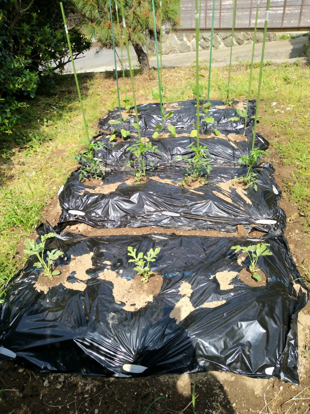 そして植え付け、手前からナス(庄屋大長)、トマト(桃太郎)、キュウリ(北進)、ピーマン(ニューエース)