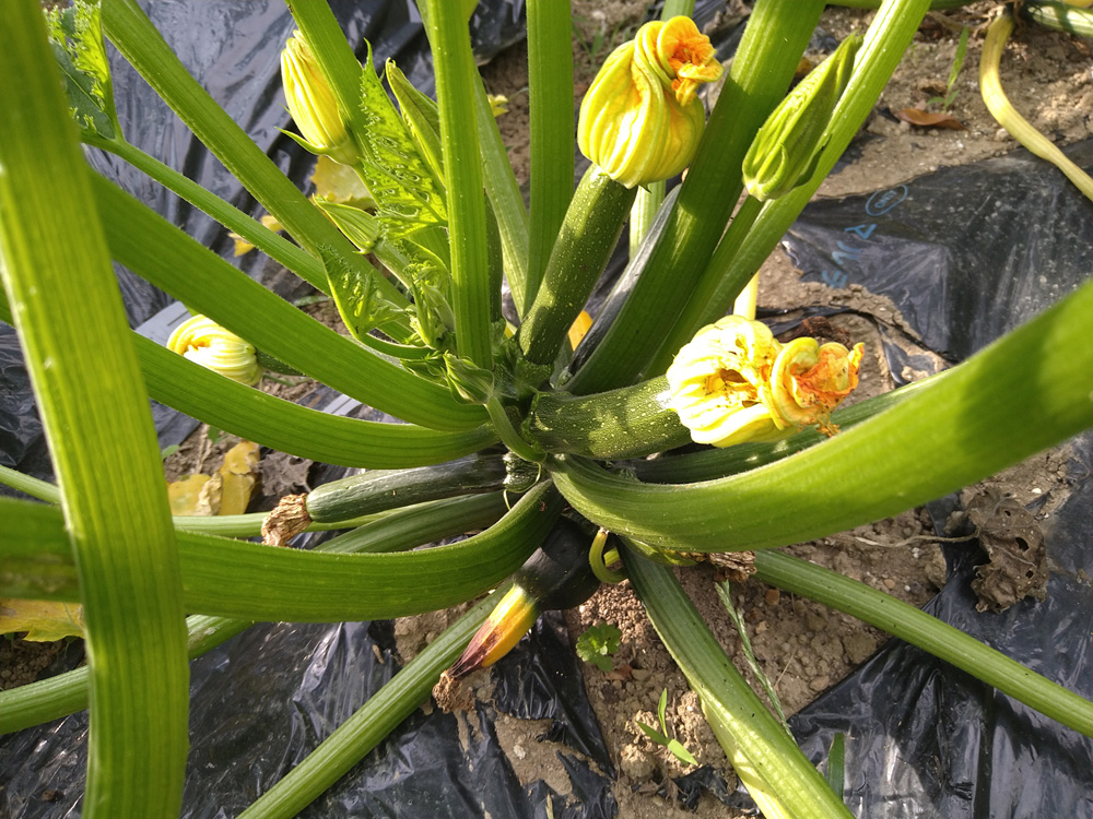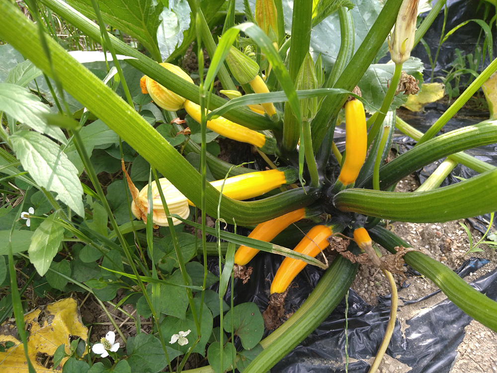 6月15日実家畑。ズッキーニは初収穫、ナスも花をつけている