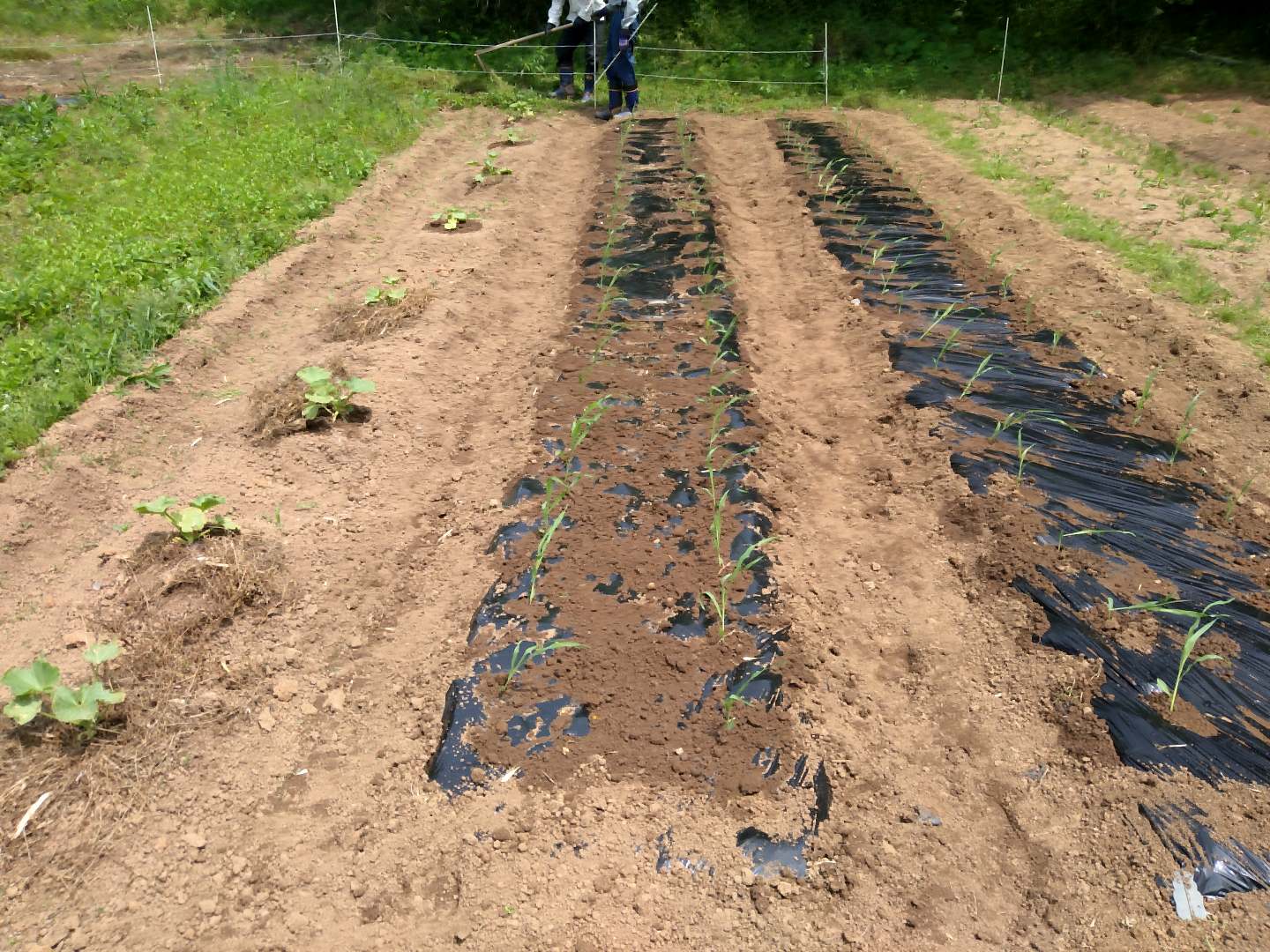 5月21日くにびき野菜研究会 スイートコーン:ゴールドラッシュの植え付け。左は前に植えたカボチャ