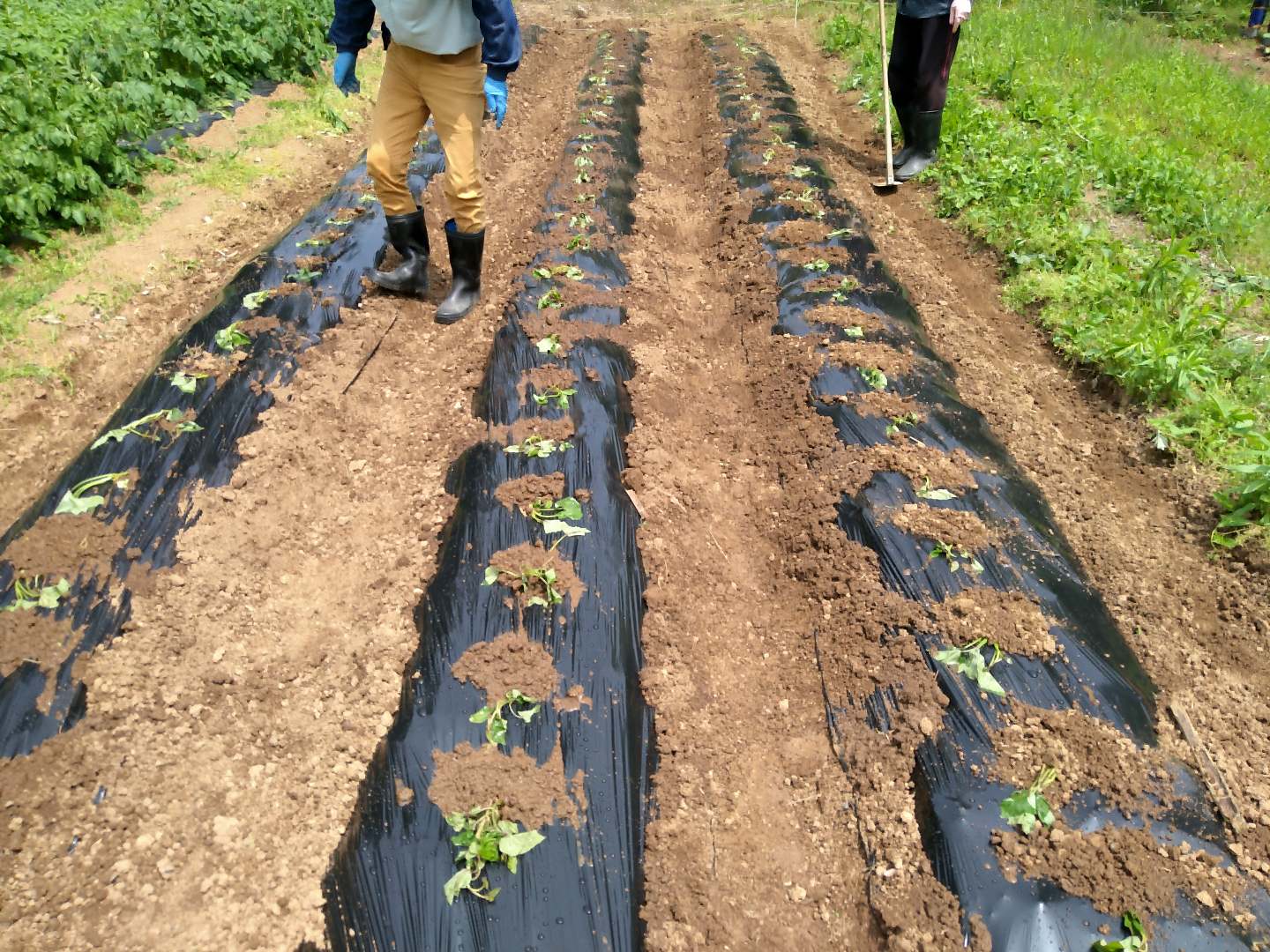 植える前に牛糞、8-8-8、苦土石灰を施肥し、植付け後に敷き藁で保護し水を十分に与えた。