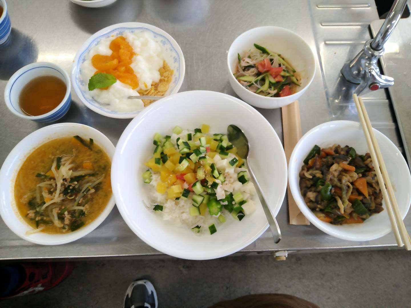 メニューは 1.蒸し魚のとろろかけ 2.きのこの酢の物 3.白玉団子入り味噌汁 4.甘栗プリン