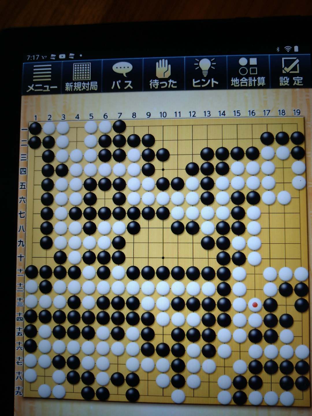 黒で中押し勝ち27目ぐらい。左中央の白を三方から囲んで目を潰した